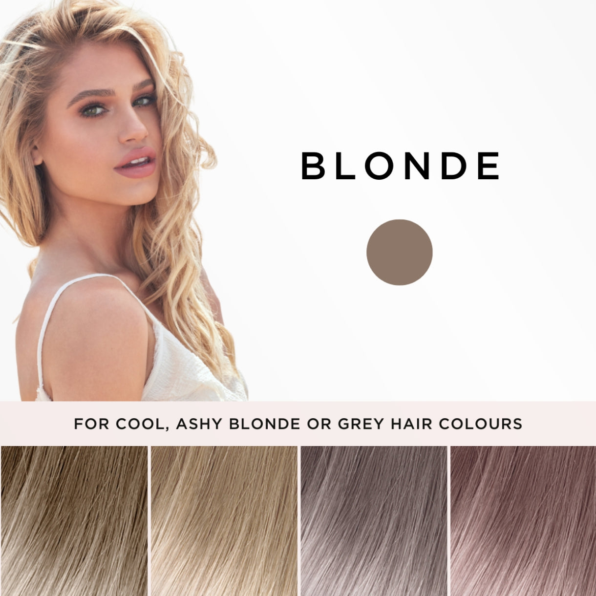 'Blonde' is a cool, ashy blonde with a greyish undertone, ideal for the lightest of blondes and silver grey hair, as well as those with cool-toned skin and a desire for fair eyebrows.