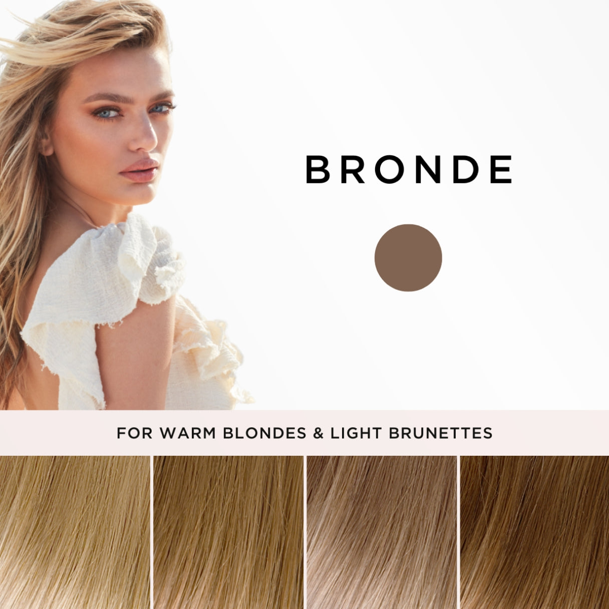 'Bronde' is a neutral blonde shade that can appear warmer on cool skin types, making it suitable for darker skin tones. It complements medium to dark blondes and light brunettes.