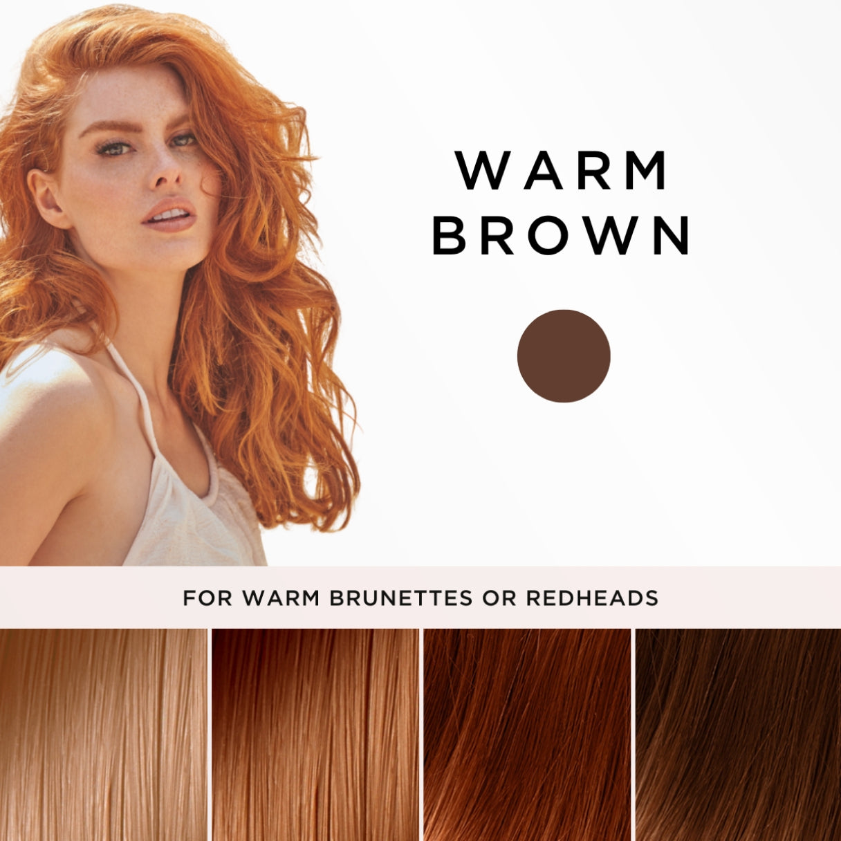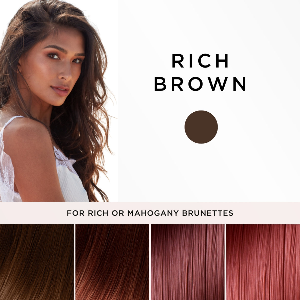 'Rich Brown' is a medium to dark brown shade with a reddish tone, ideal for warm brown brunettes and auburn hair. On deeper skin types, it appears more as a neutral brown.
